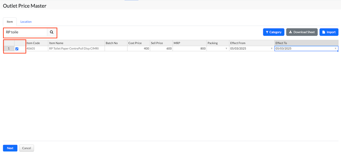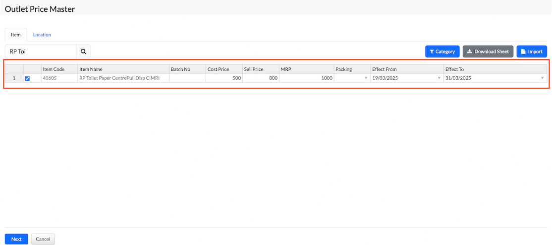 For example, during festival seasons when prices may vary, customers can use the Outlet Price Master screen to update the price details accordingly.