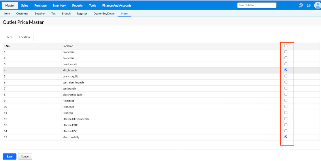 6.In the Location tab, select the location for which the price is being applied using the checkboxes and click Save.