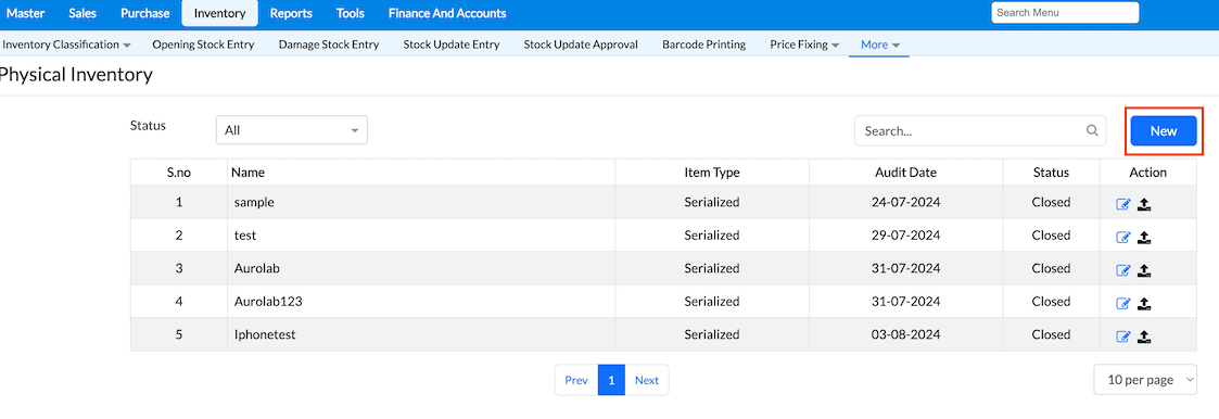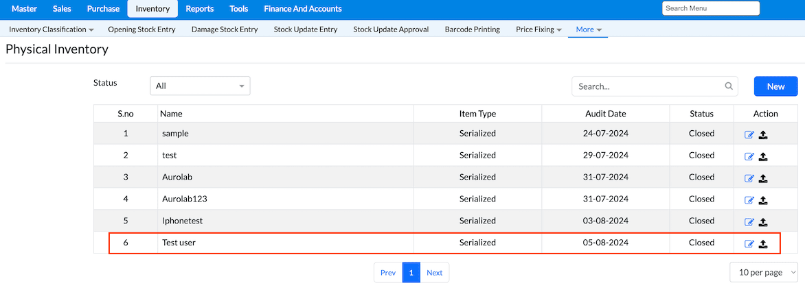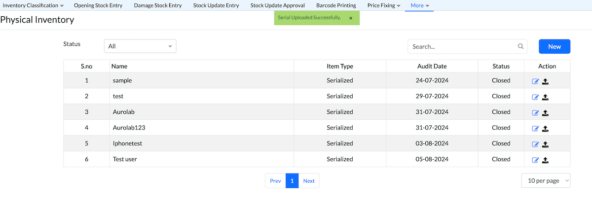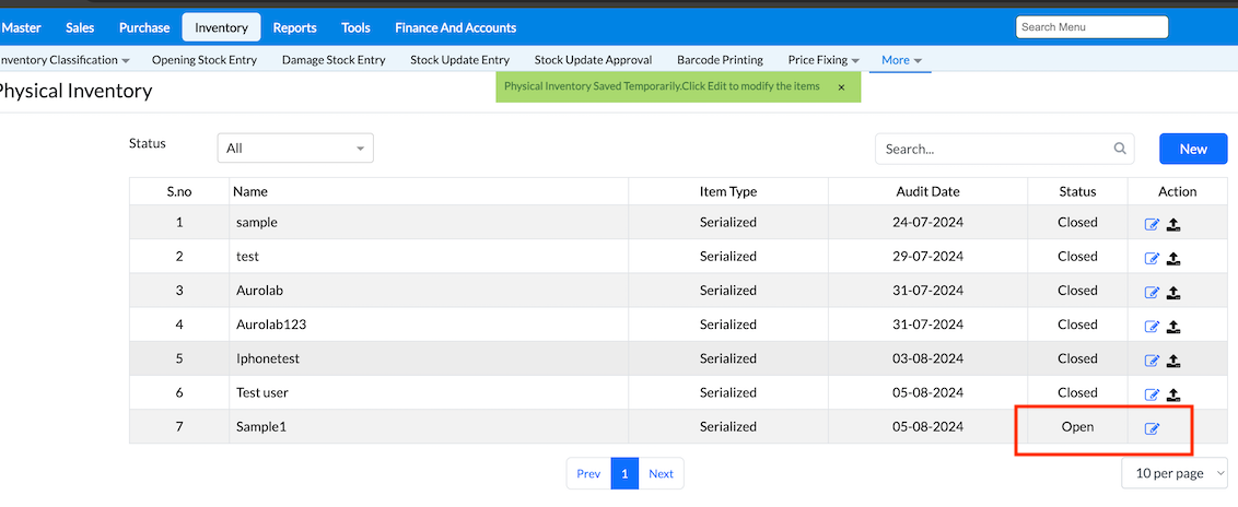 After ward, if you want to add or modify serialized items, you can click the 'Edit' icon next to the same physical inventory name to make changes, then save your updates.