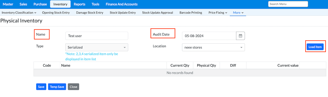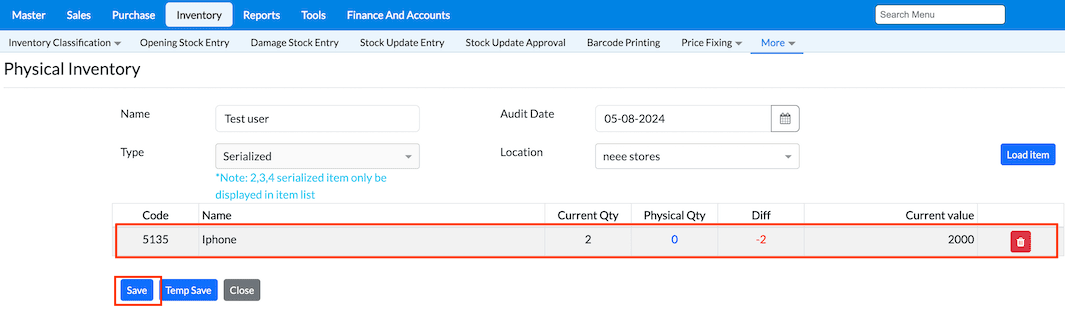 Temp Save Purpose: When entering serialized items to reduce the stock to zero ,if you need to add few more items under the same physical inventory name ,then use Temp Save option.(If you perform session wise stock audit in your store). This allows you to pause your progress and resume seamlessly later.