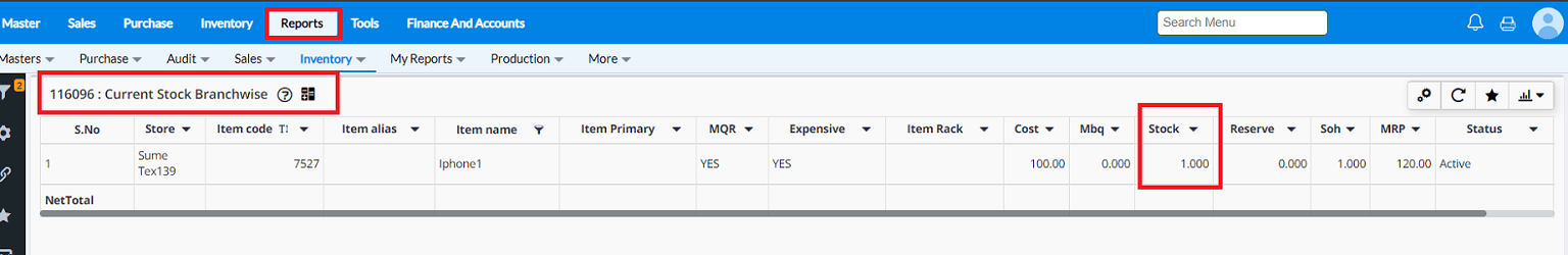 6.Then you can check the stock in Reports-->Inventory -->Stock ledger--> Current Stock Branchwise Report. The stock for the respective item has been restored.