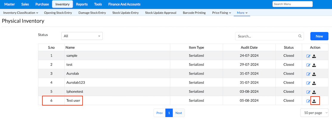 For instance, Sl no. 6 physical inventory (Testuser) has 1 item with 2 quantities that have been updated to zero stock, now you can restore the stock using an upload for the same two quantities alone not for the other serial numbers.