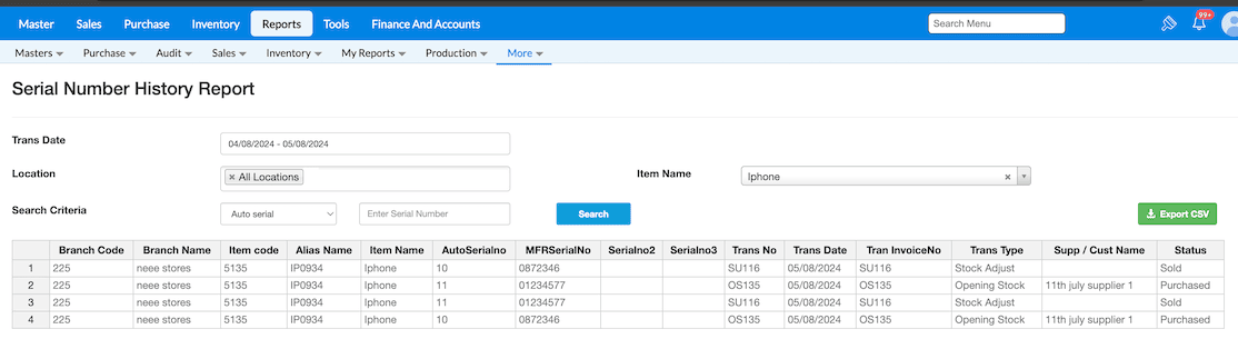 3.You can check the overall status in Reports--> More--> Serialized Report -->Serial Number History Report.