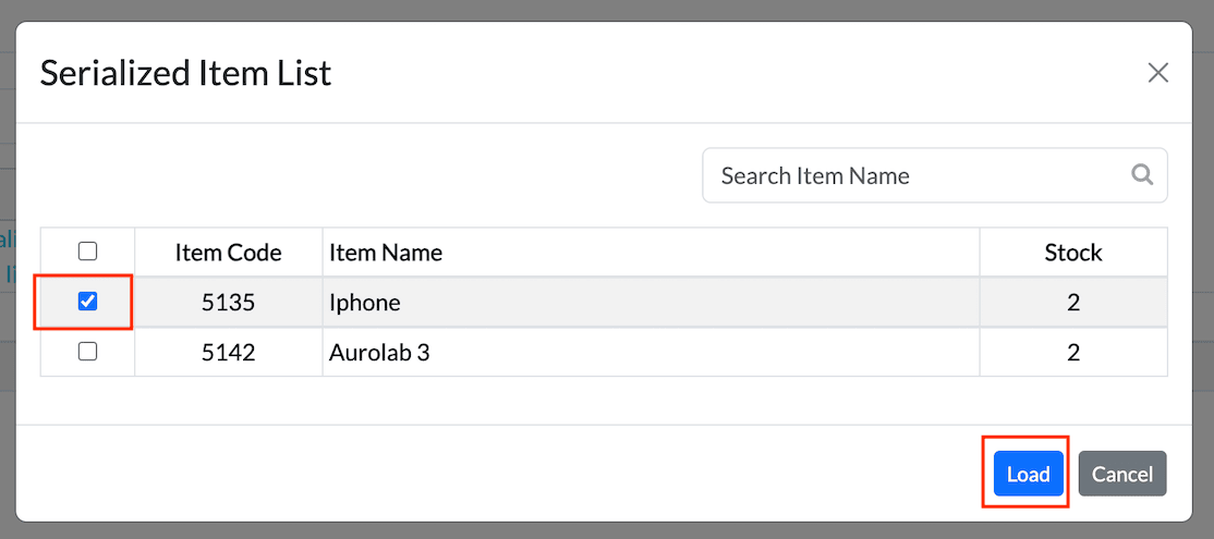 4.It will display the serialized items that have stock.Select the item(s) which you want to reduce the stock to zero and then click the Load button. If you want to select all the items, click Select all checkbox, which located at the top of all the checkbox. To select specific items, click the checkbox against each item.