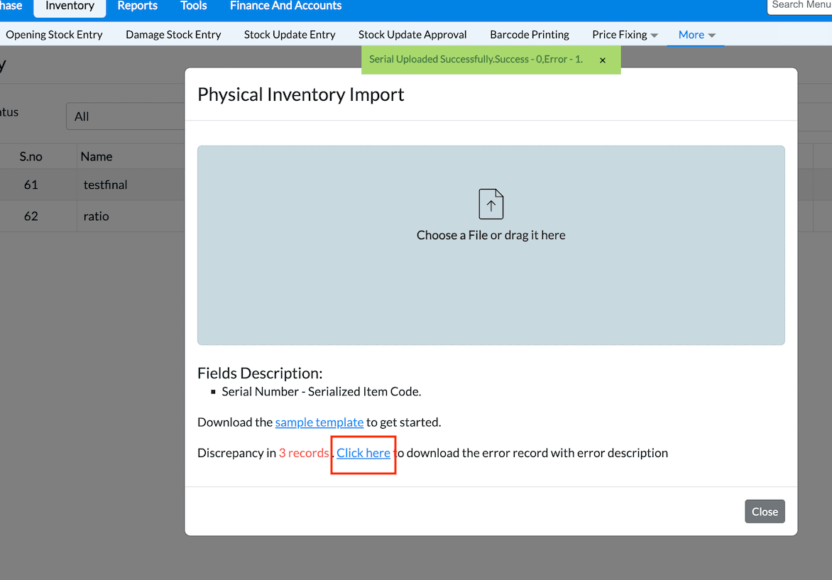 2. You will get Physical Inventory Import Pop-up ,where you have to select download "Sample template" and then download the serial_file.csv sheet.
