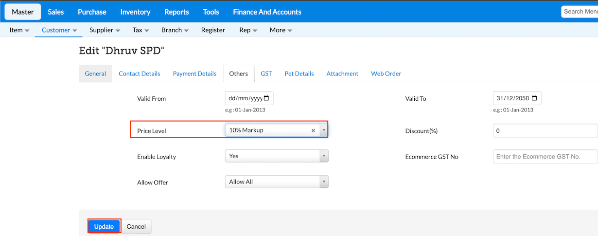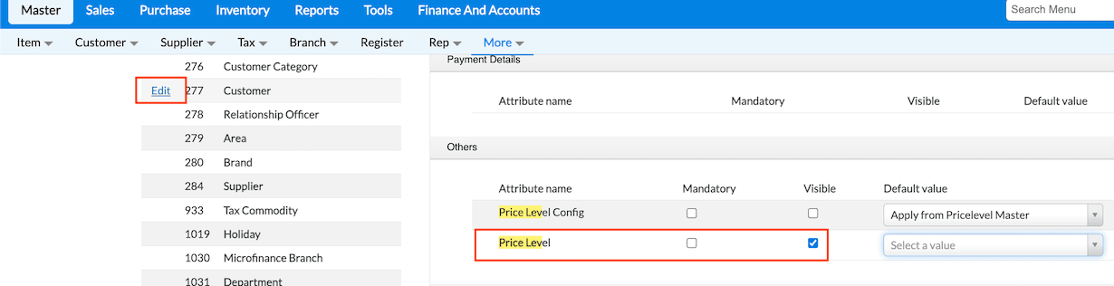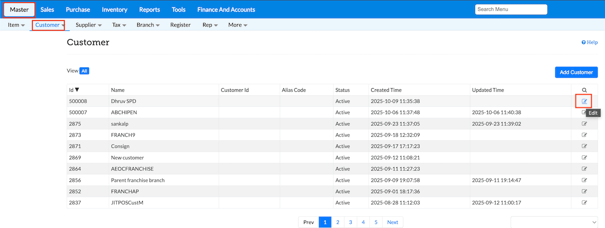 Click Masters → Customer → Click Edit against the Customer for whom you to apply prices defined in the Price Level.