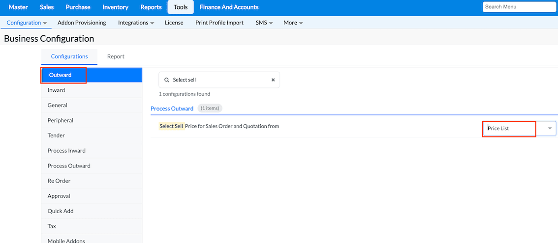 To enable the Price List, click Masters → Tools → Master Configuration.