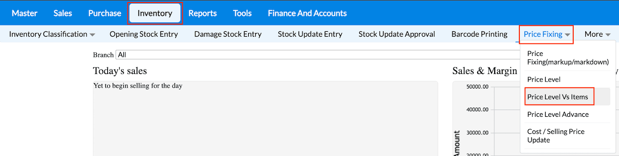 1. From Dashboard, Navigate to Inventory → Price Fixing → Price Level vs Items.