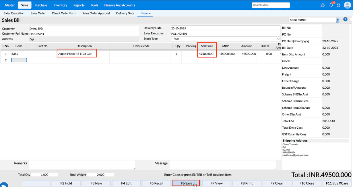 5. Press F6 Save to save the bill.