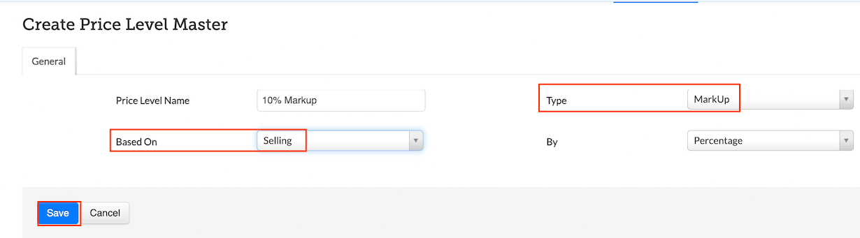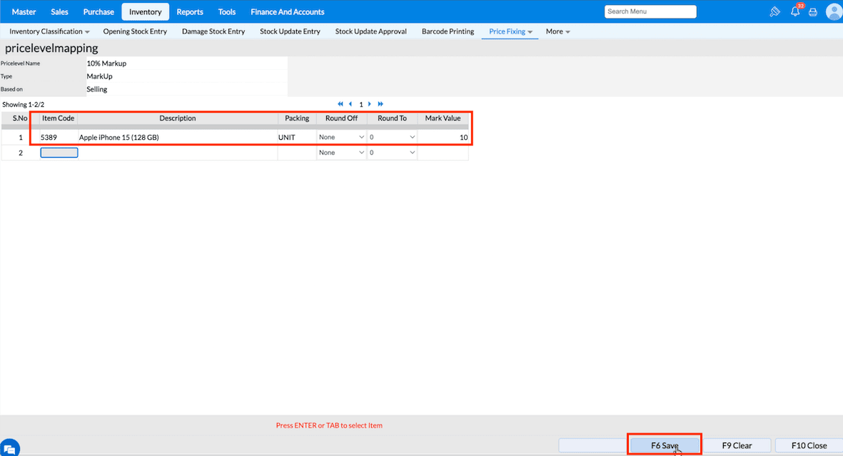 Enter the Mark Up or Mark Down value as per the selected Price Level definition.