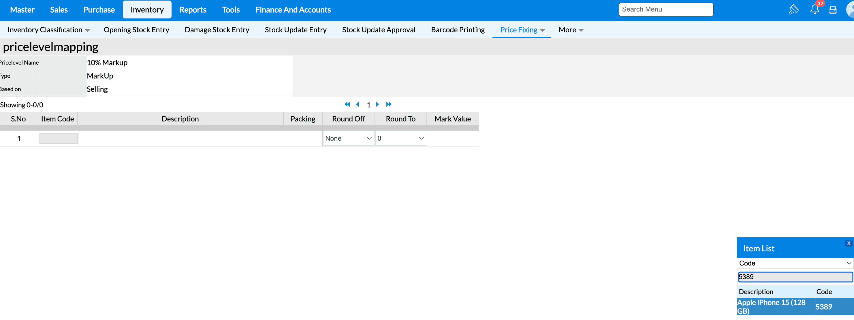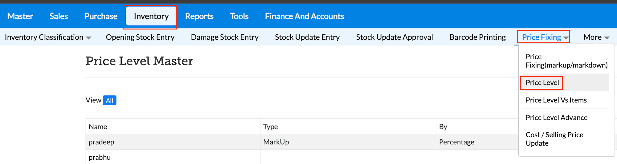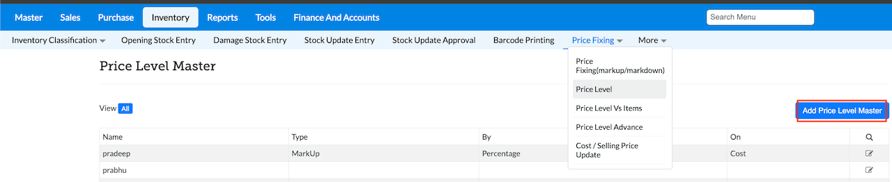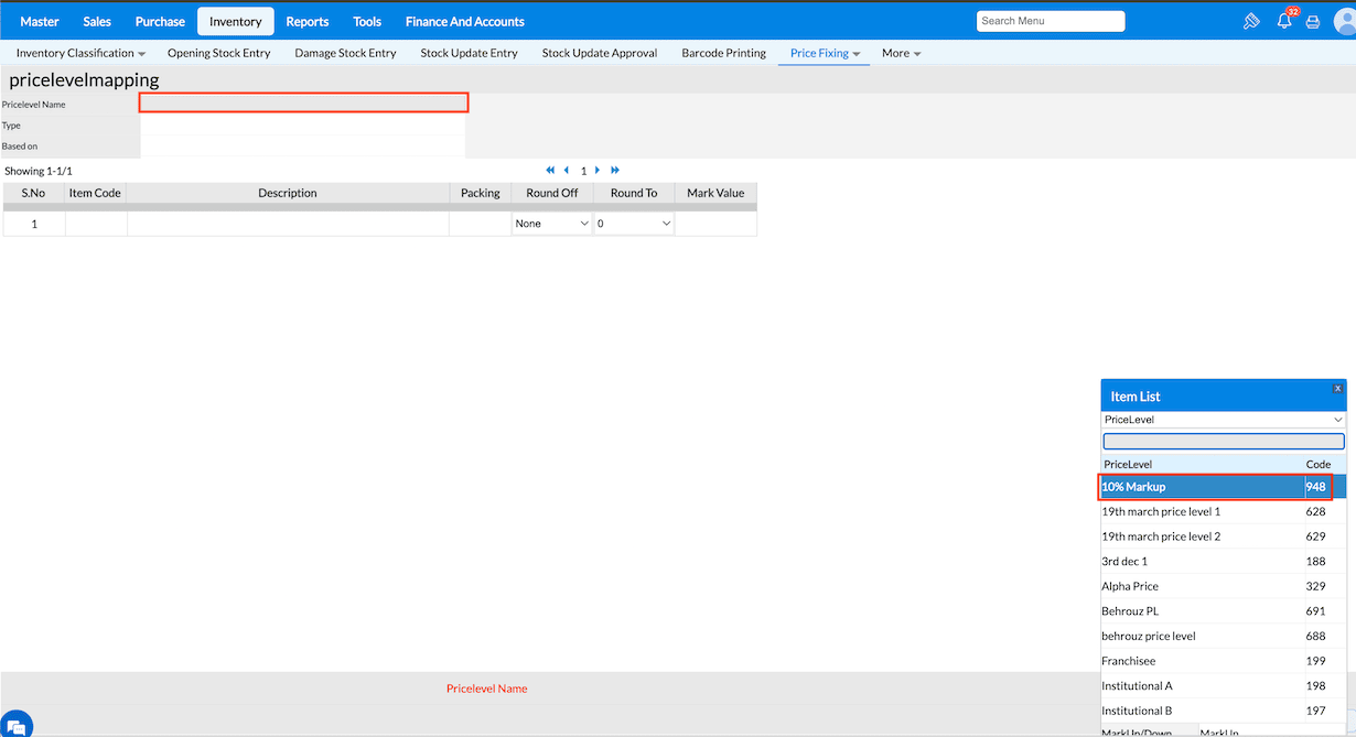 1. Navigate to Inventory → Price Fixing → Price Level.