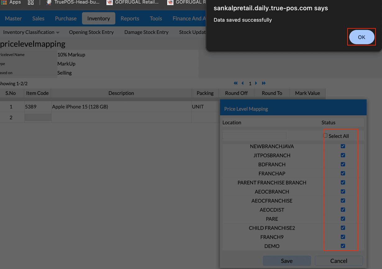 Select the location to map the Price Level and click Save. A “Data saved successfully” message will appear — click OK to confirm.