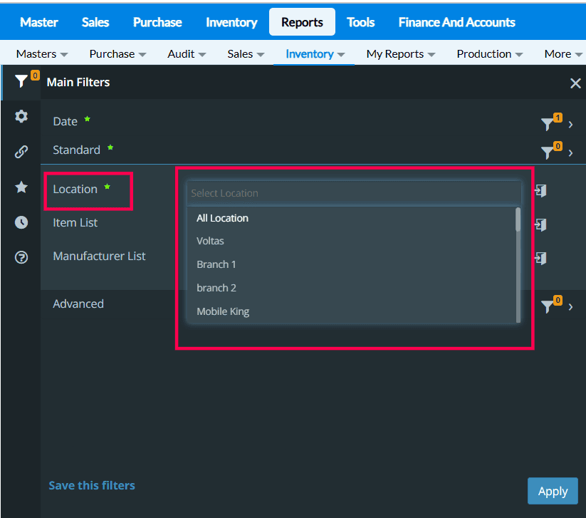 3. From Standard Filter Select the Branch from the Location list.