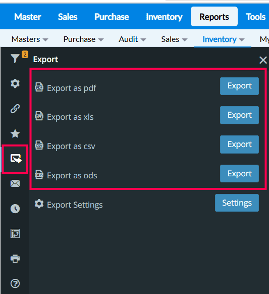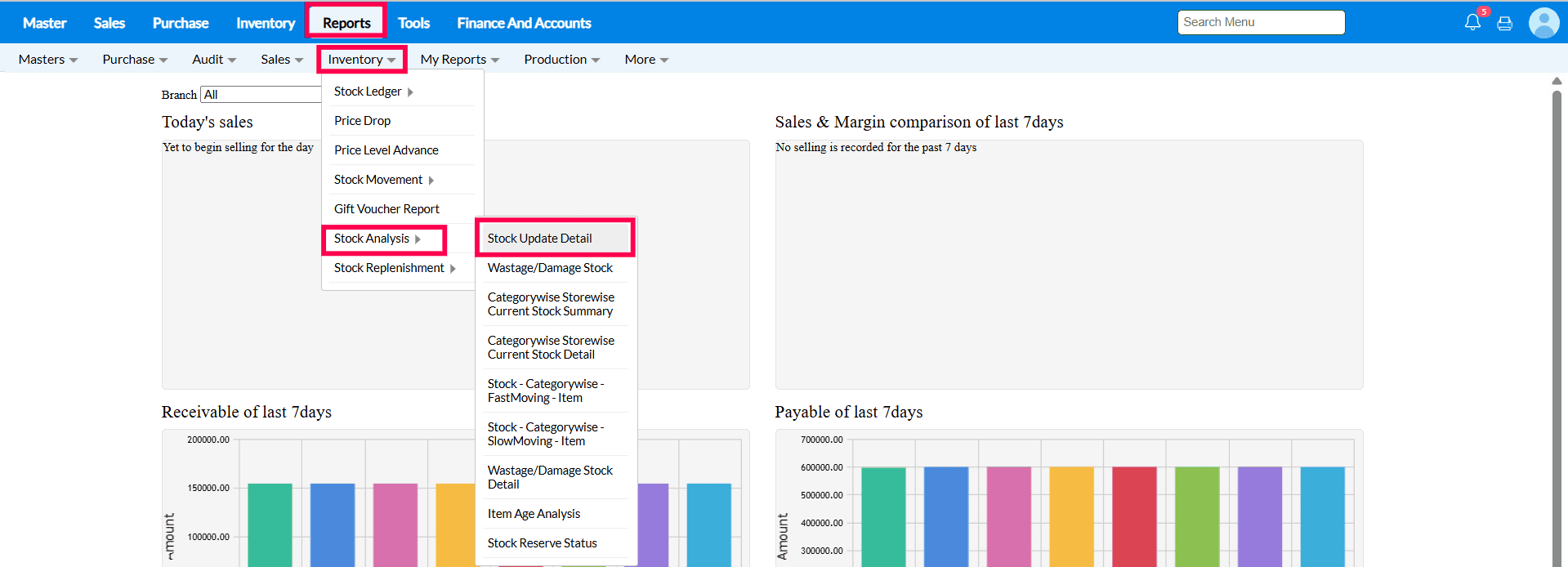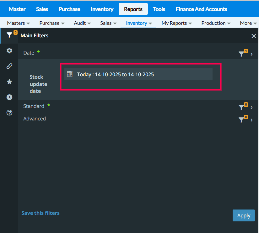 1. Click Reports > Inventory > Stock Analysis > Stock Update Detail Report
