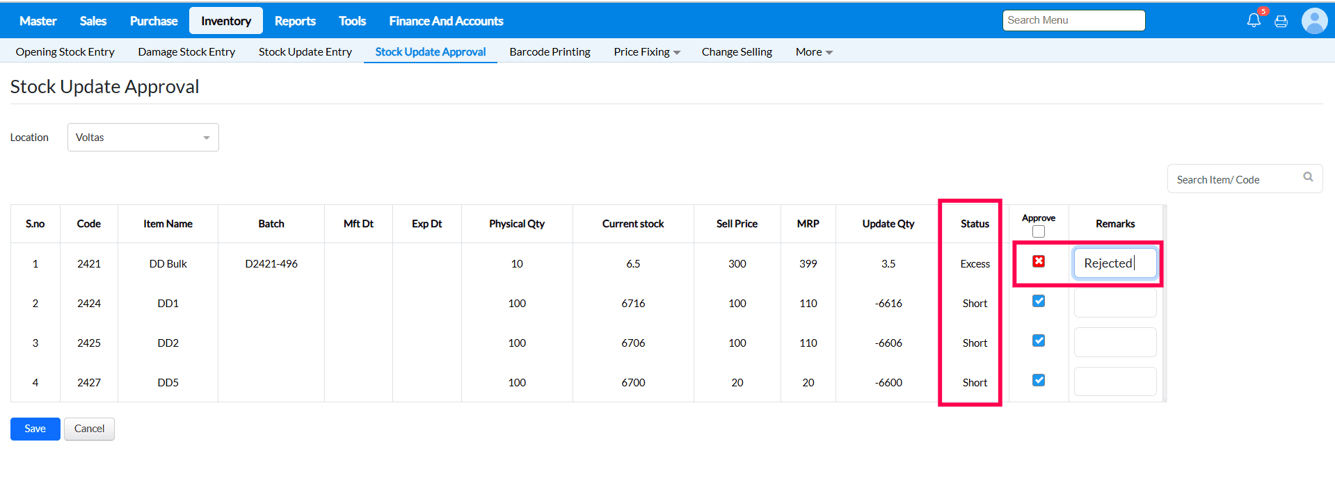 Stock update approval is a mandatory process followed after putting stock update. The Stock Update Approval enables you to review the stock on-hand quantity differences posted in Stock Update Entry screen and decide if the stock quantity change can be approved or rejected.
