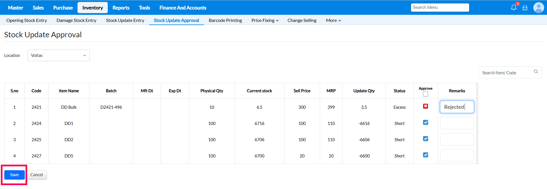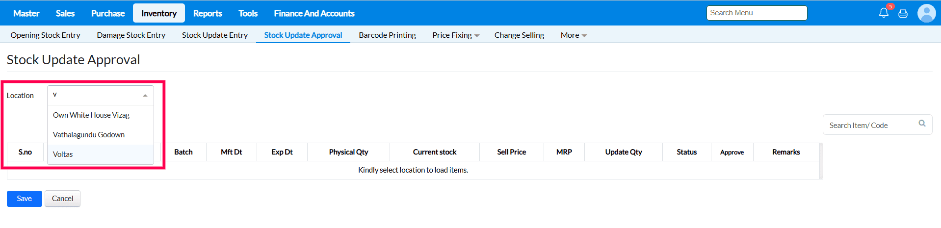 2. Select the Location Through Drop Down then list of pending Stock update Approval item will display.