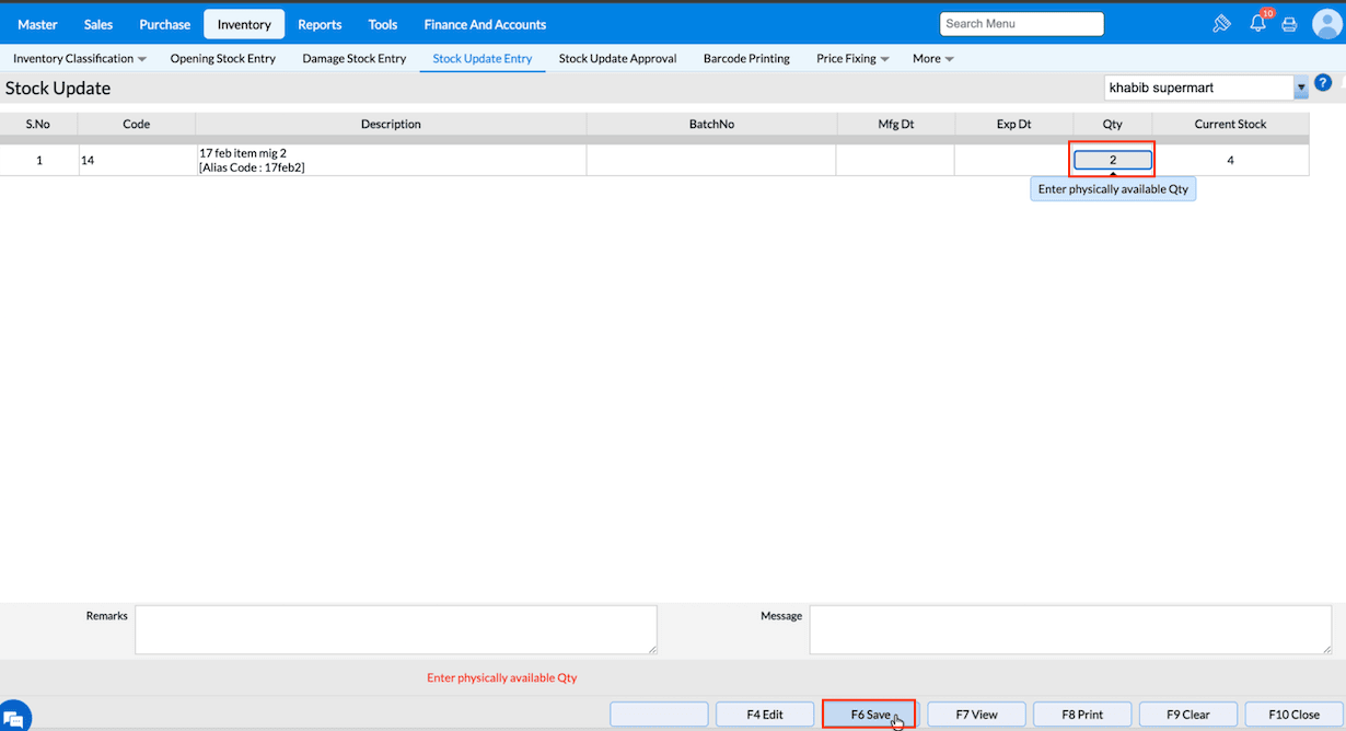 3. Click F6 Save to save the stock update details.