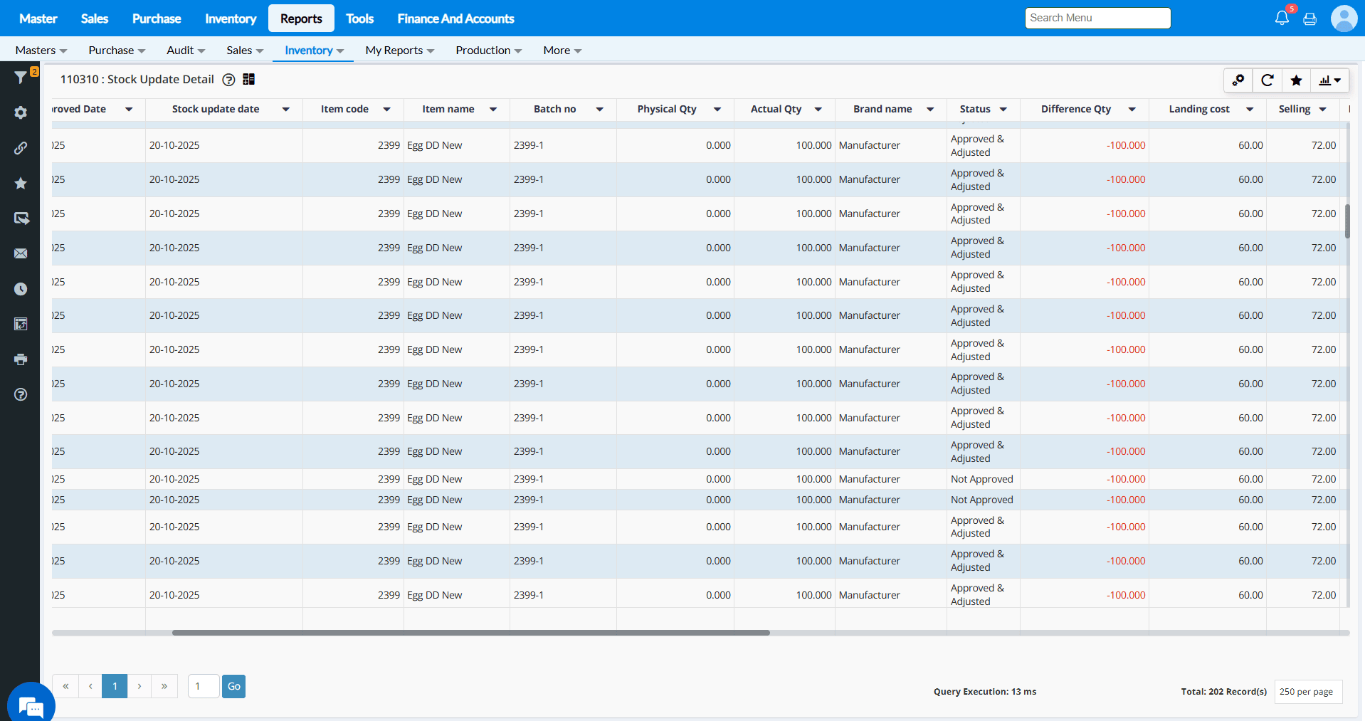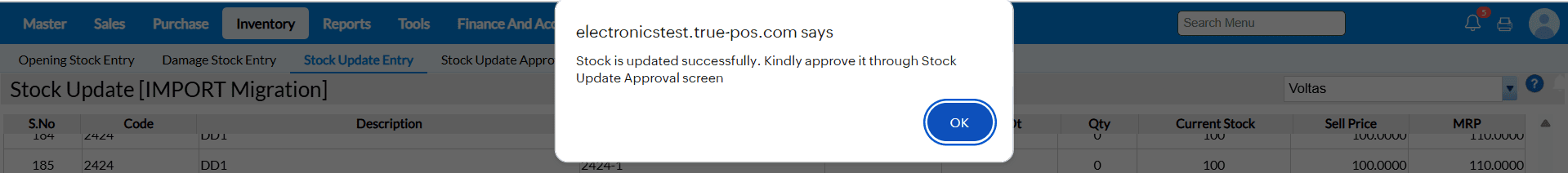 → Go to Reports->Inventory->Stock Analysis->Stock Update Details Report. In the Status column you can check whether stock has been Approved successfully or Not Approved