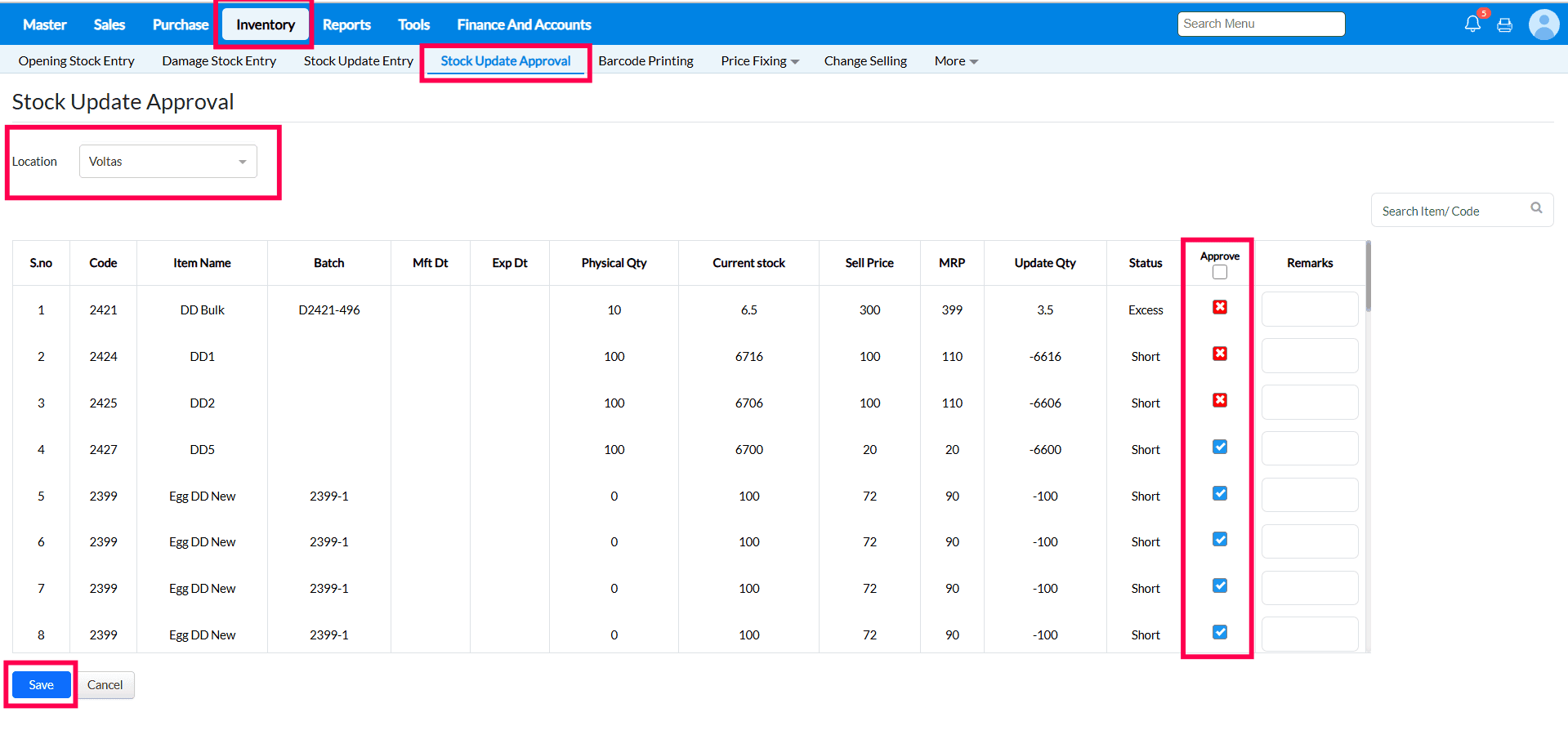 8. Go to Inventory->Stock Update Approval. Click on Location from dropdown select the location then all pending stock updates will display, from approve you can approve and reject as per condition then click on save.
