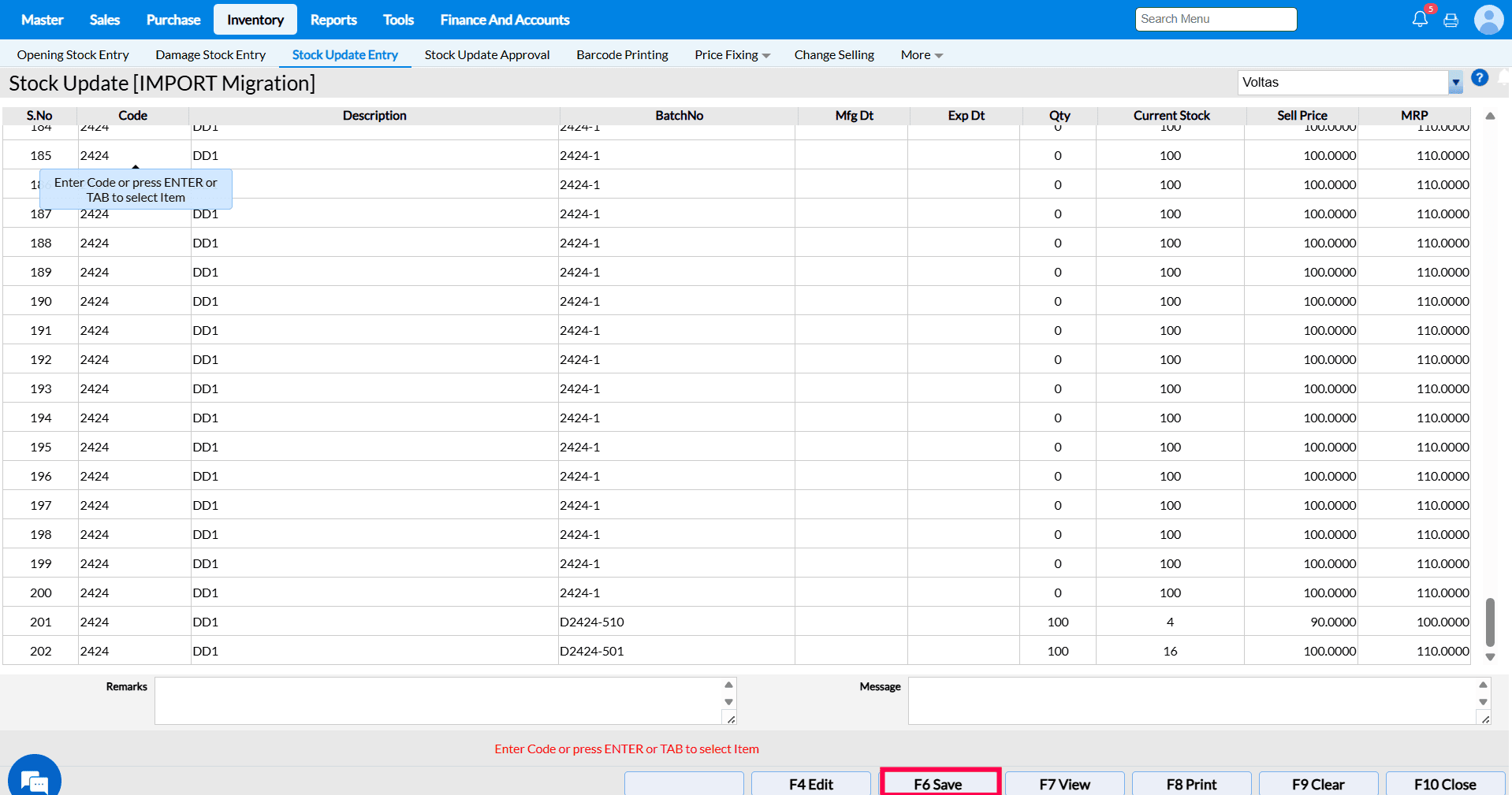 1. Go to Tools-> Master Migration Select Master: Stock update