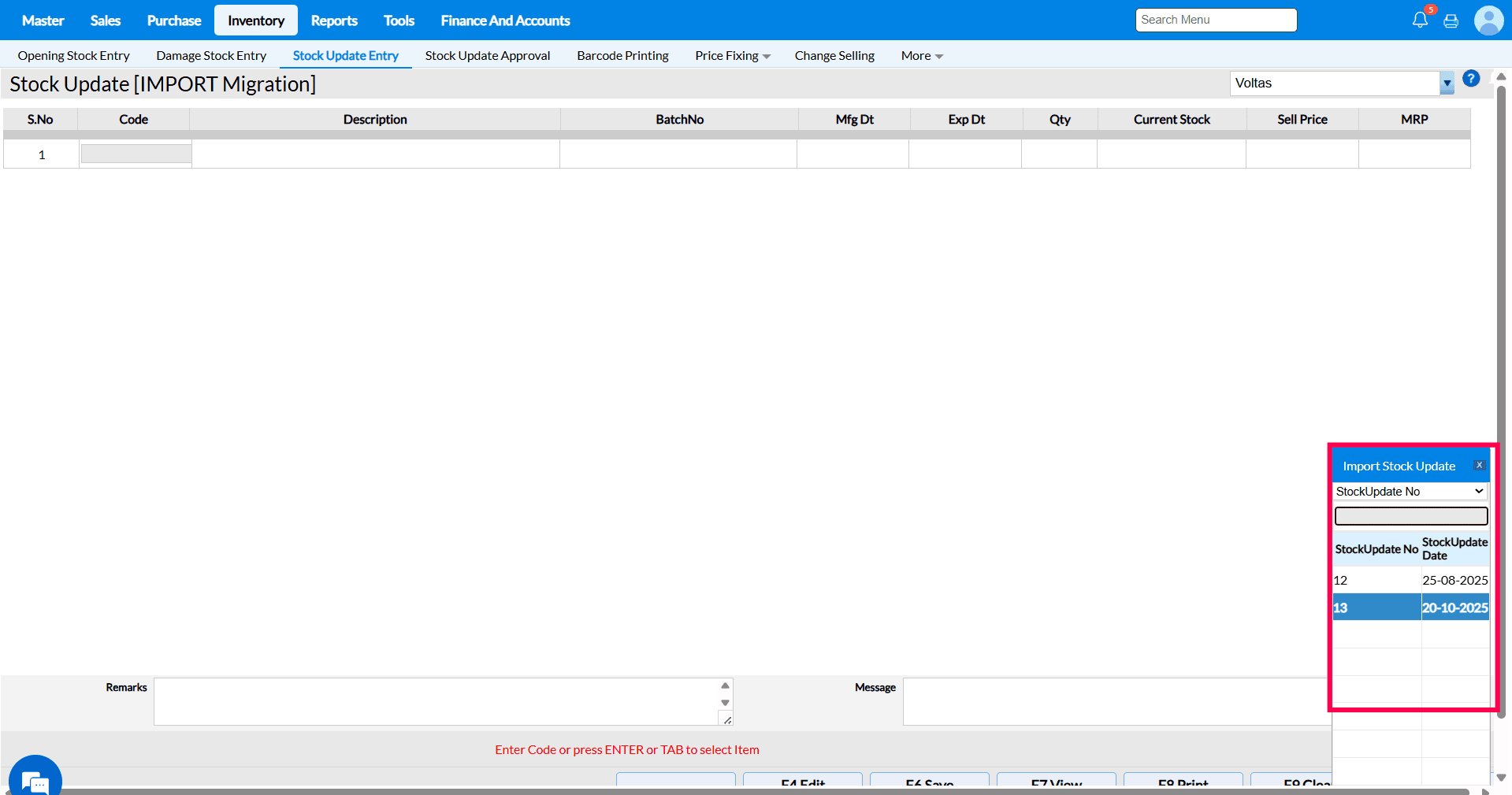 5. Go to Inventory -> Stock update entry. Select the Branch name for which you are updating and Press Ctrl+F2 Import SU and select the Stock Update No.