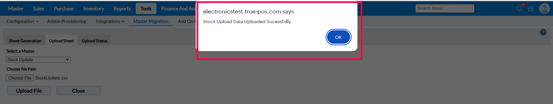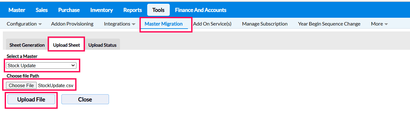 3. To upload the sheet, Click on Upload Sheet and select master → Stock Update then browse the file and click on Upload file