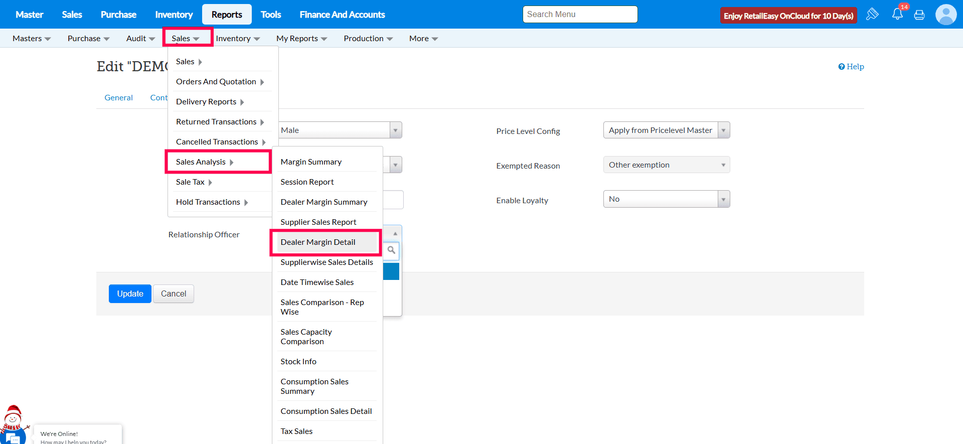 Navigate to Reports > Sales > Sales Analysis > Dealer Margin Detail.