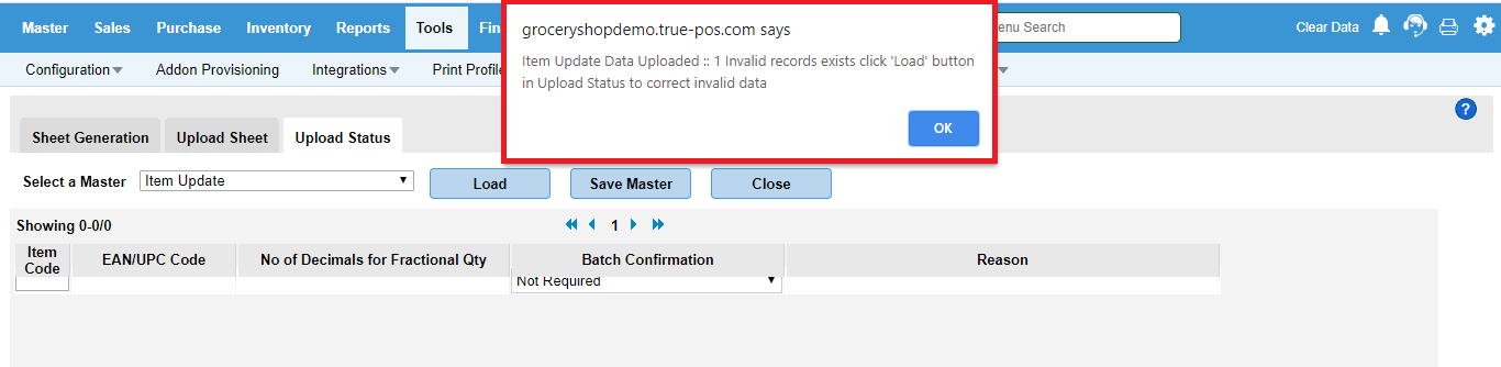 Solution : You will get this message if the column value does not satisfy column conditions. In the same master migration menu, click on upload status menu, select the same master from the dropdown and click on load button. The invalid records will be loaded along with the reason. You can correct the invalid record in the same menu and click on save master button. The data will get saved successfully