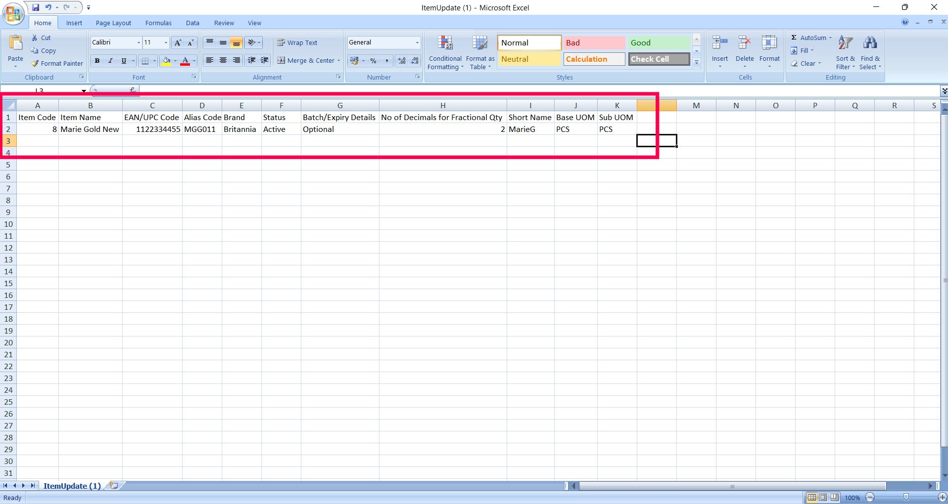 Step 5 : Fill out the provided template with the information of Item Code, Item name, EAN code, Alias, Manufacturer No. as per the details.