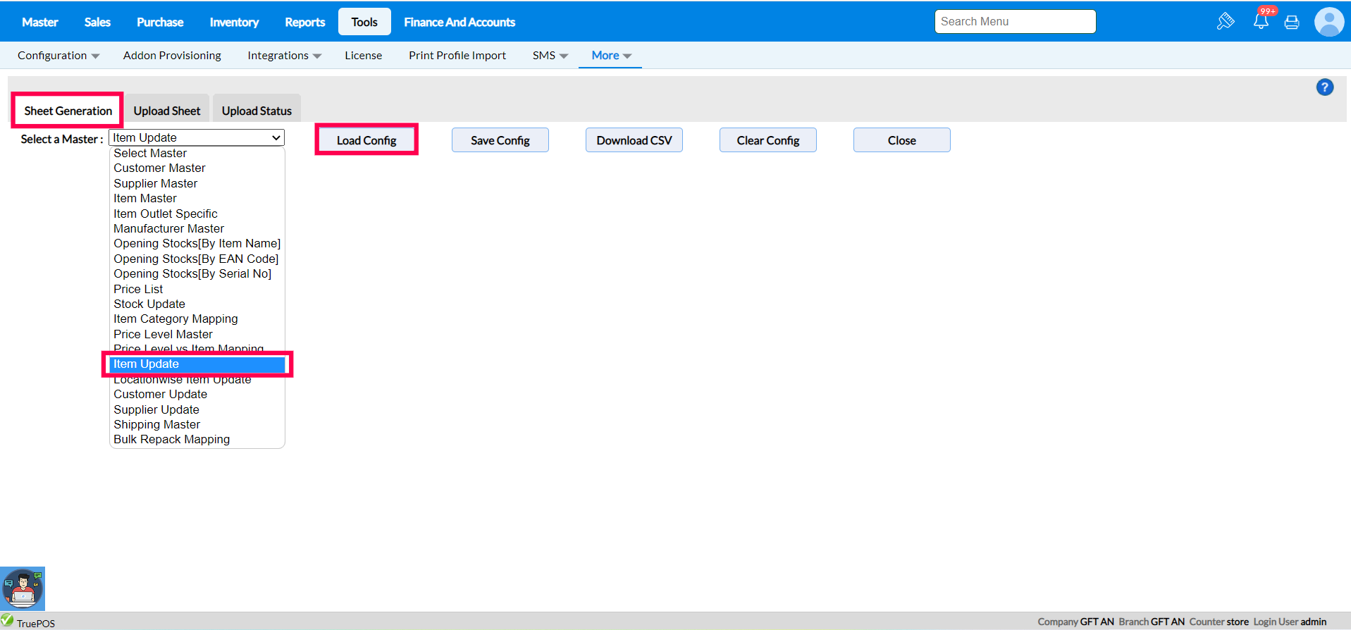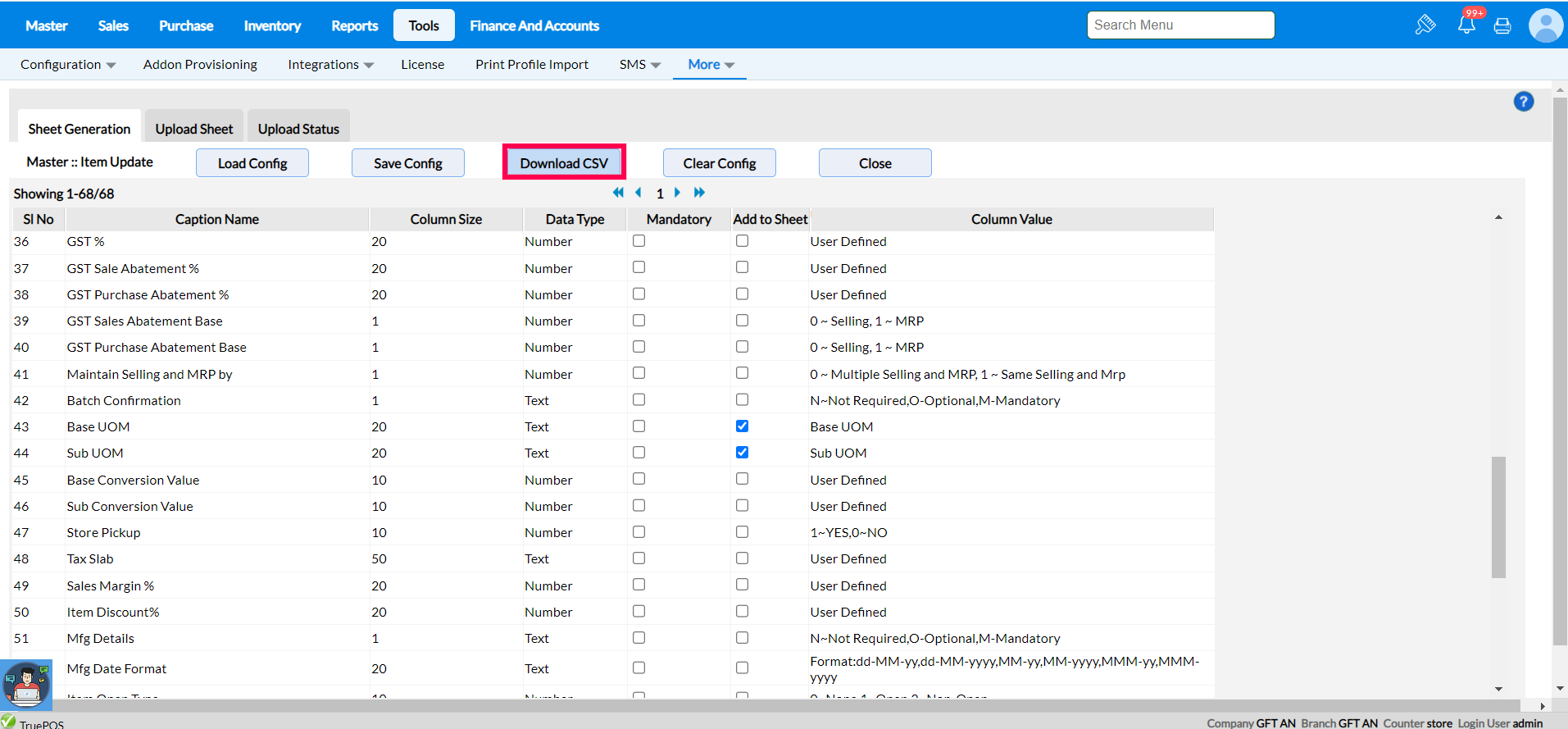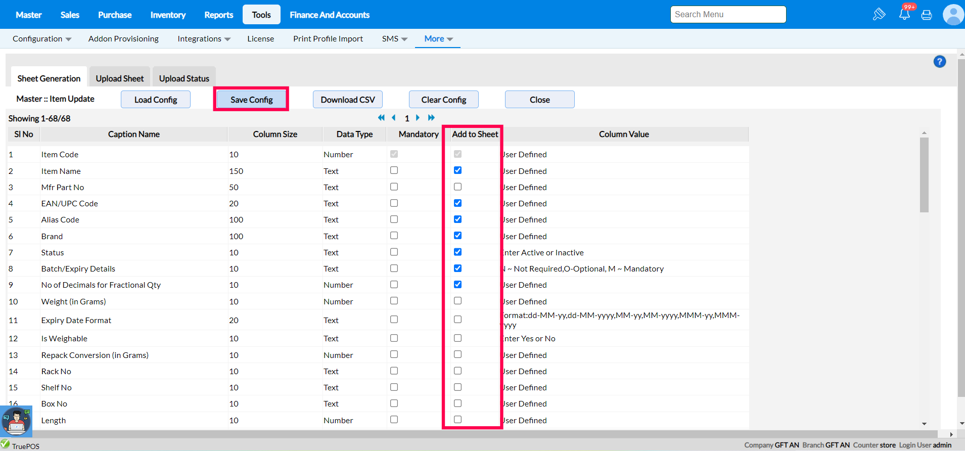 Step 3 : Select the Load configuration option after choosing Master from the list to see the appropriate Caption name, Column size, Add to sheet and Data type.