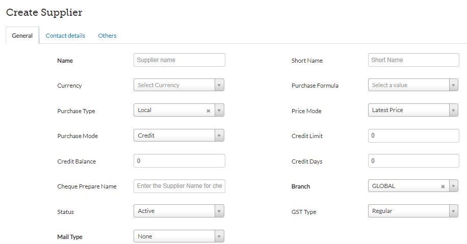 Branch - Select the Branch to which the Supplier supplies goods, from the field drop-down. If the Supplier supplies to all Branches, choose Global from the drop-down. Else, choose the particular Branch that the Supplier supplies goods to.