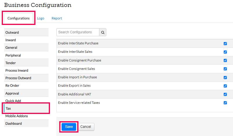 Step 3: From the Configurations section, choose Tax. Tick the check-boxes of the required taxes to enable them. Click on Save.