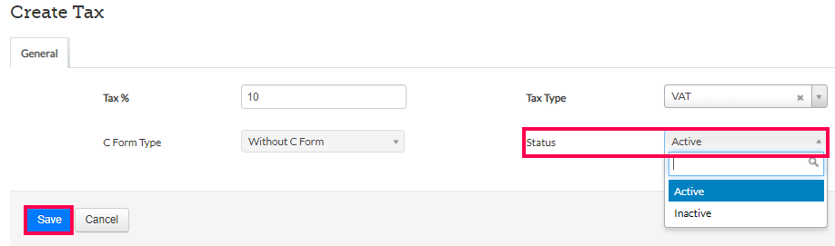 Step 5: If the tax is presently valid, assign the Status as Active, else Inactive (from the drop-down). Click on Save.