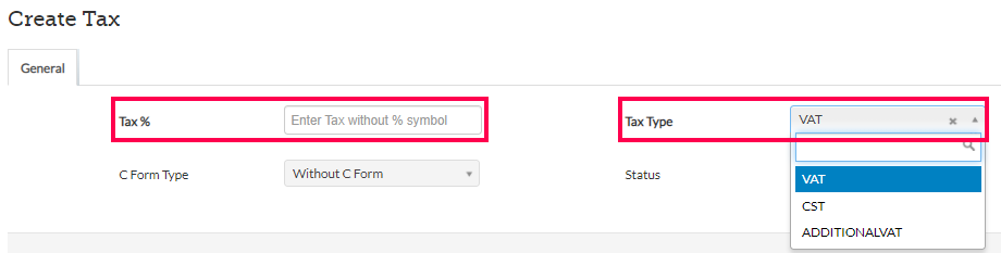 Step 4: In the General section of the Create Tax screen, enter the Tax % and choose the Tax Type.