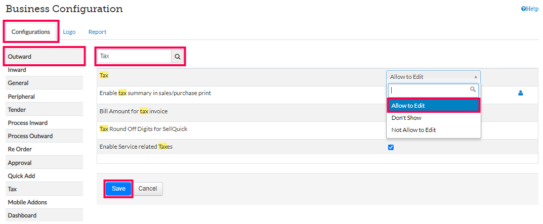 Step 4: In the Configurations section, choose Outward and search for Tax. From the drop-down of the Tax field, choose Allow to Edit option. Click on Save.