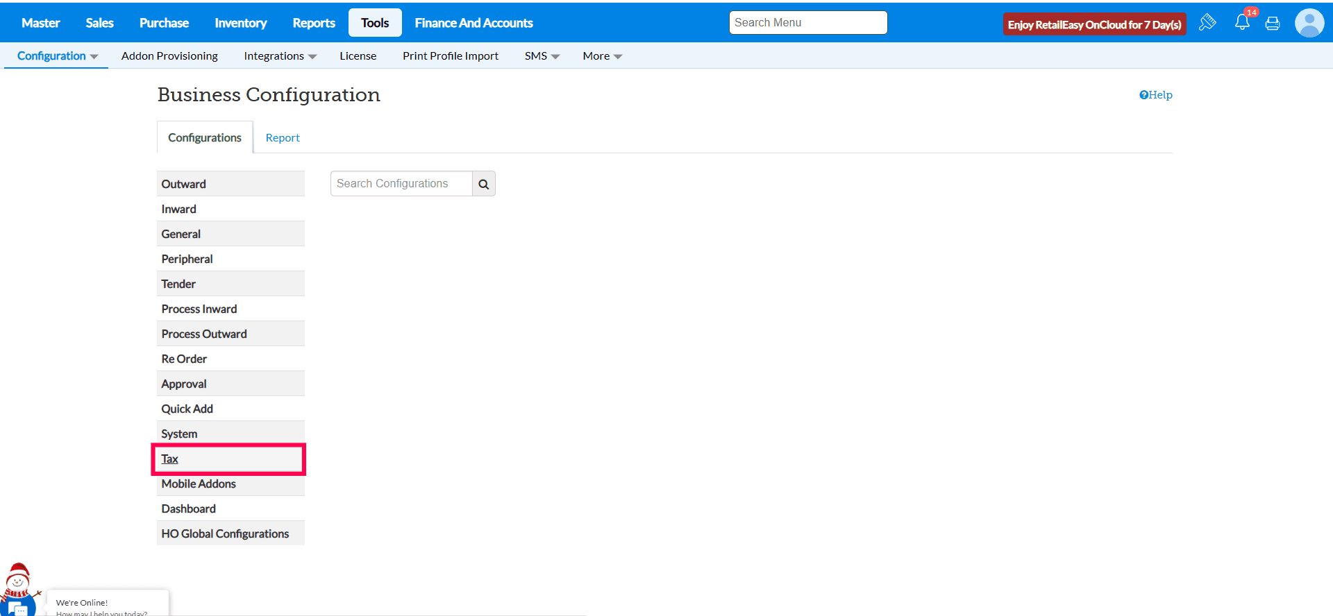 Navigate to Tools > Configuration > Business Configuration > Taxes section.