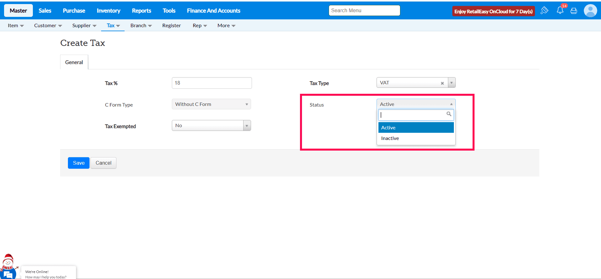 To deactivate a tax temporarily, select Inactive from the Status list.