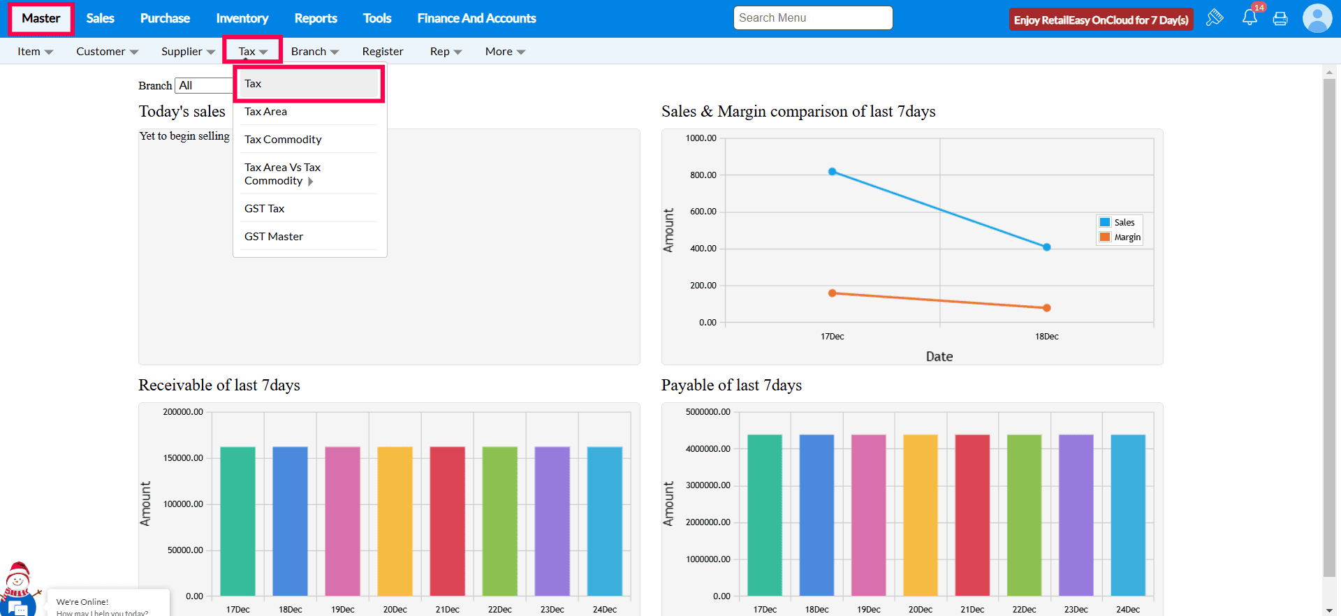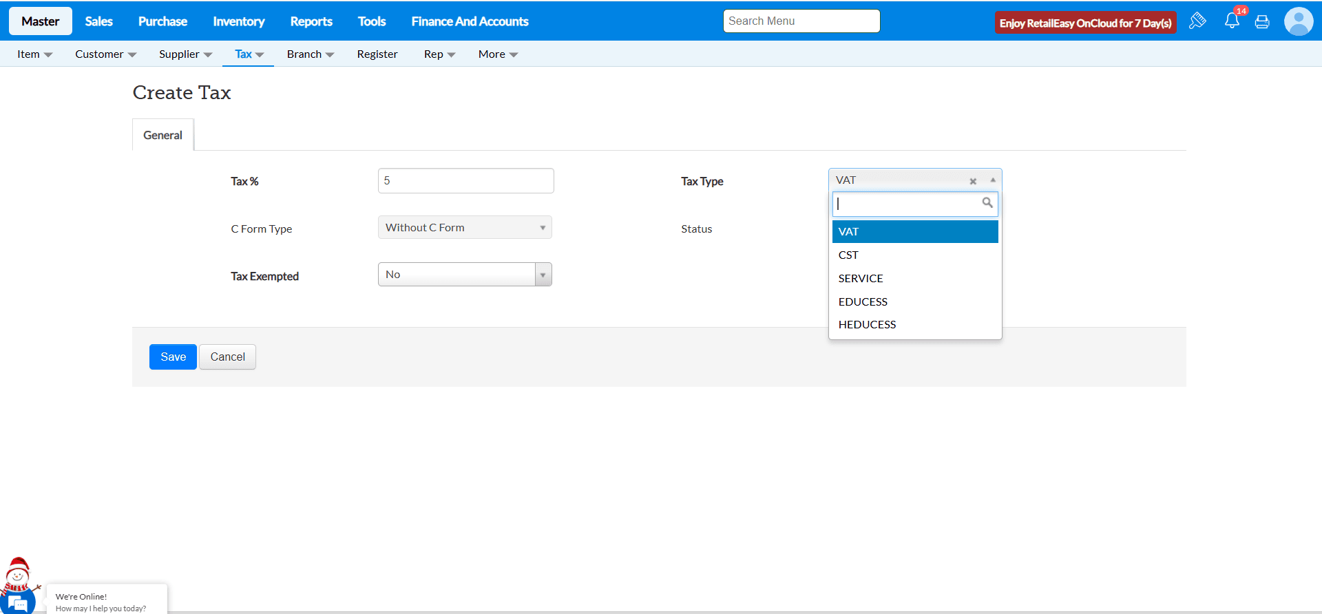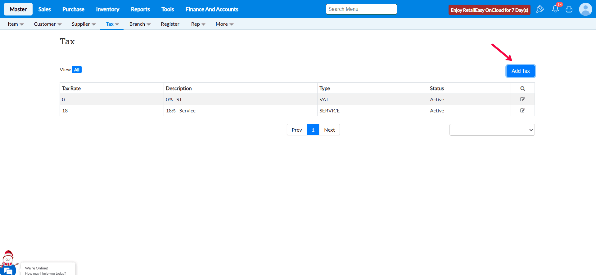 Navigate to Masters > Tax > Tax.