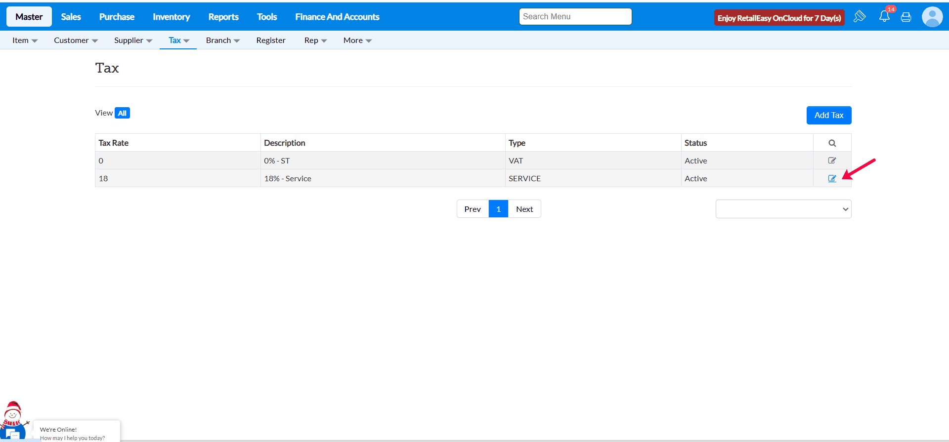 Edit the tax entry, update the Tax%, and click Update to apply the new rate.