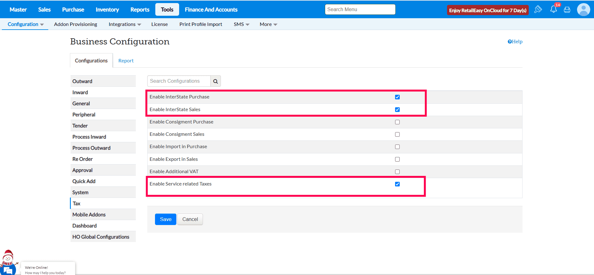 Navigate to Tools > Configuration > Business Configuration > Taxes section and select the Enable Service Related Taxes checkbox.