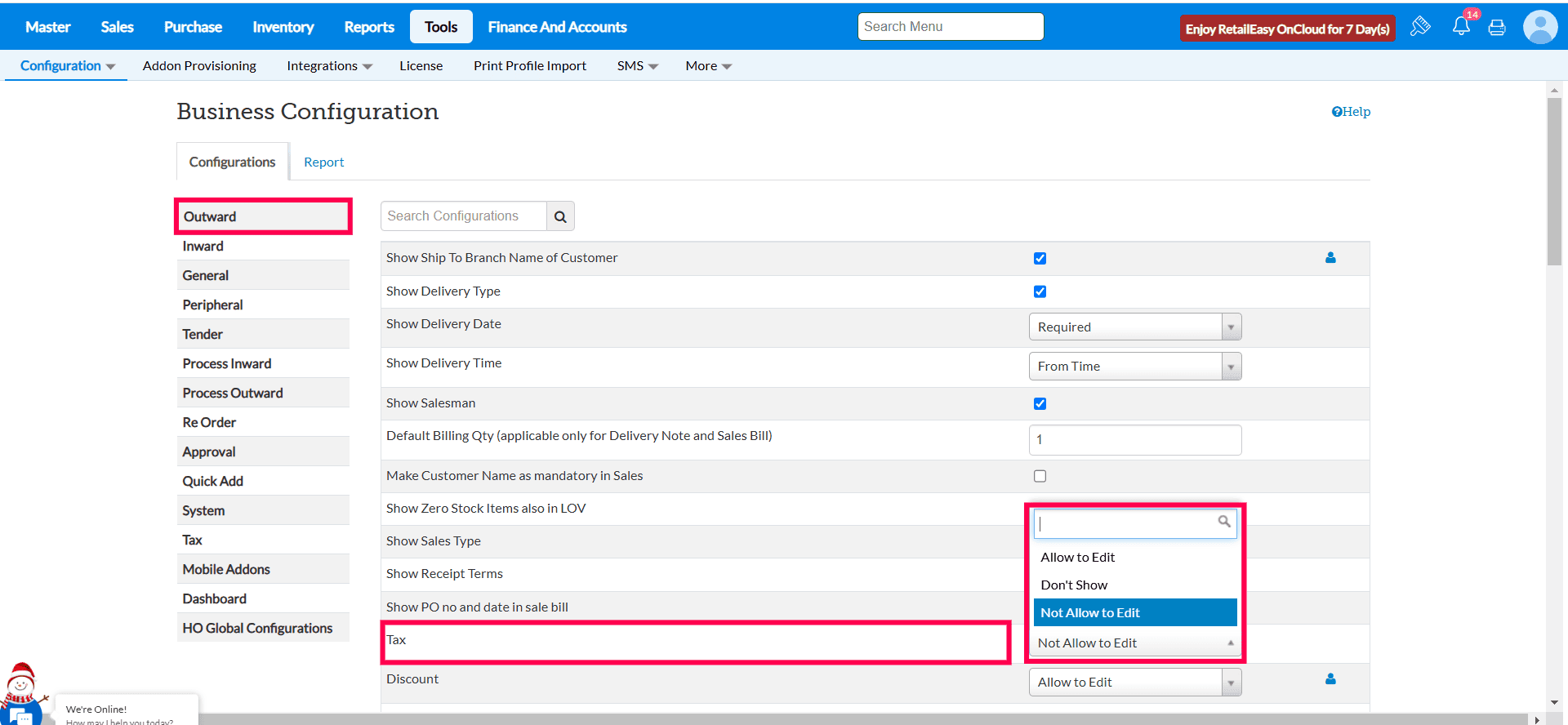In the Outward section, use the checkboxes to allow or deny tax editing during sales.