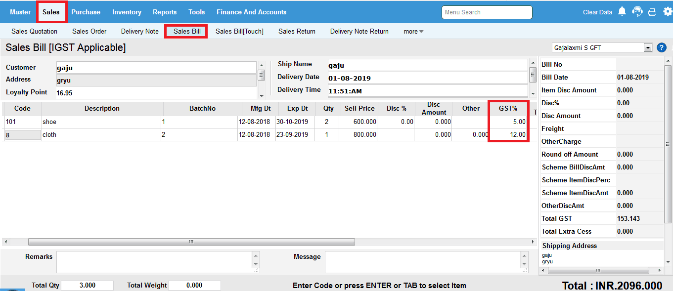 For the item Cloth, if the selling price is within the range of 100 to 5000, the GST tax percentage is automatically applied as 12%.