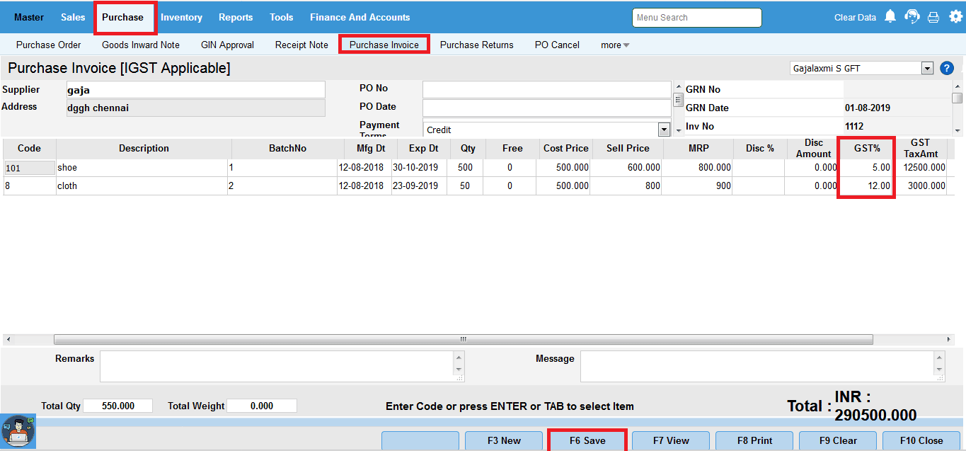 Check the applied GST percentage in the Purchase Invoice or Sales Bill screens.