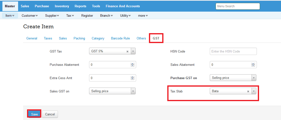 In the GST Tab, select the applicable Tax Slab from the dropdown menu.