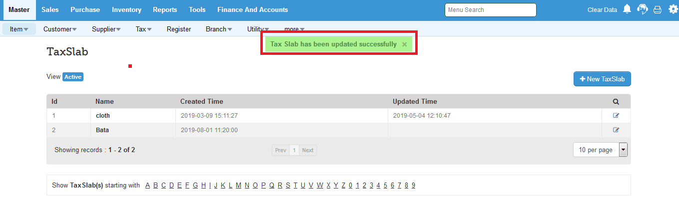 A confirmation message, "Tax slab has been updated successfully," will appear.