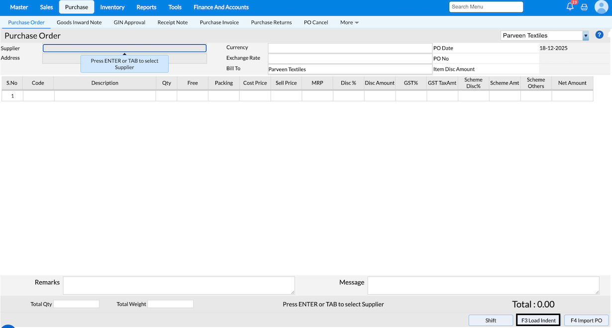 We can check in Indent summary report under Reports module. If you want to check the status, then navigate to Navigate to Reports → Inventory → Stock Replenishment → Indent based on replenishment. 7) How does the “Automatically Raise Indent as Purchase Order” configuration work? Answer: The Purchase Order will be created for the default supplier mapped in the Item Master, eliminating the need to manually create a PO from the Indent You can view the Indent in the Purchase Order screen. The generated Purchase Order can then be converted into a Purchase Invoice by using the Load PO option in the Purchase Invoice screen.