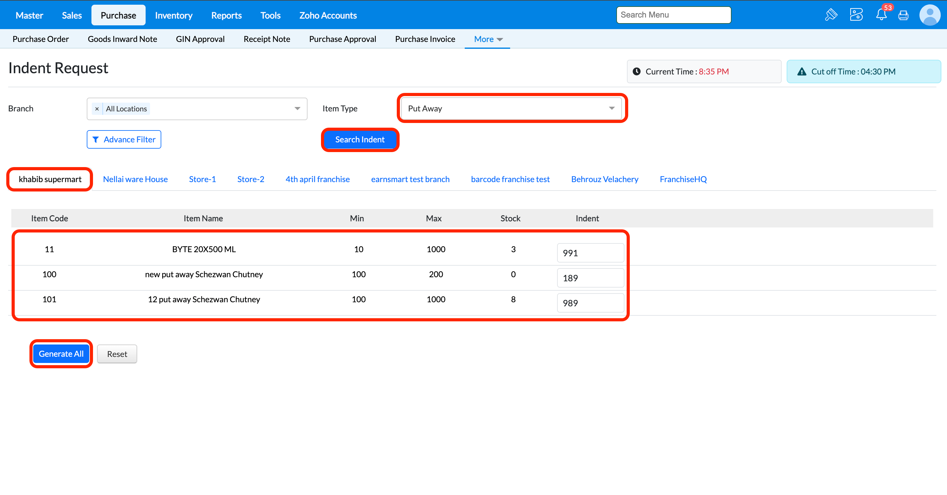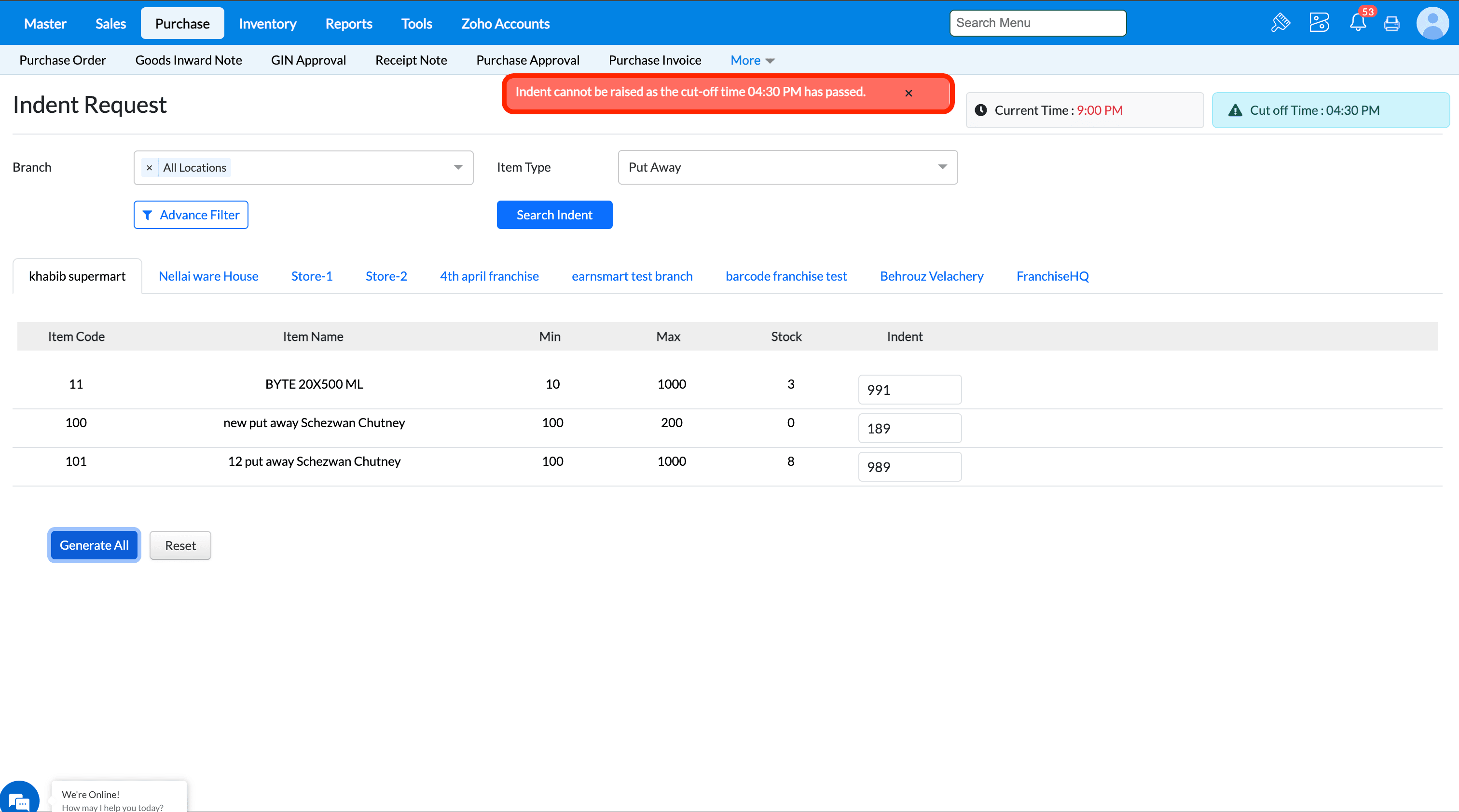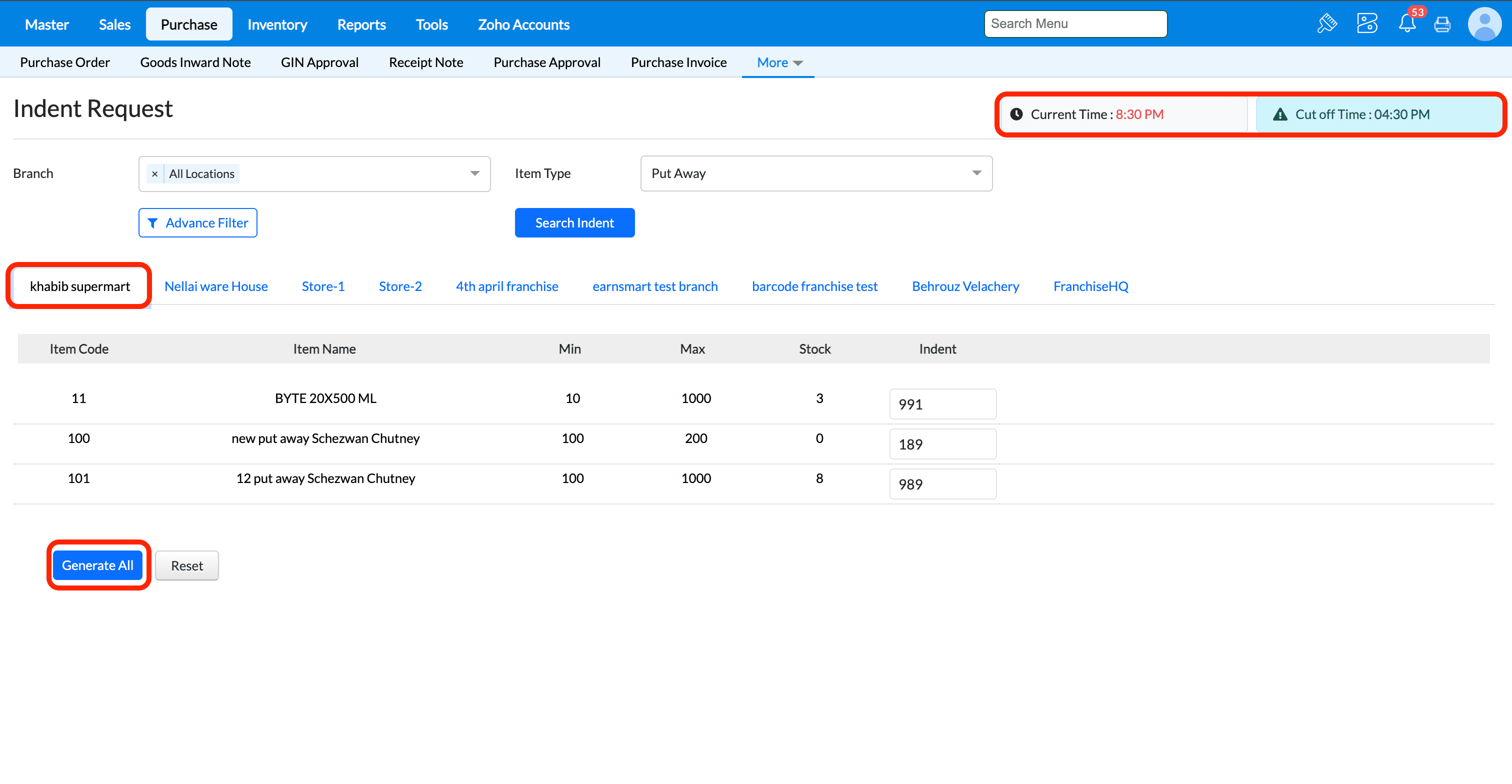Pre-requisite - To know how to configure indent cut off time refer help doc - https://community.gofrugal.com/portal/en/kb/articles/indent-cut-off-configuration