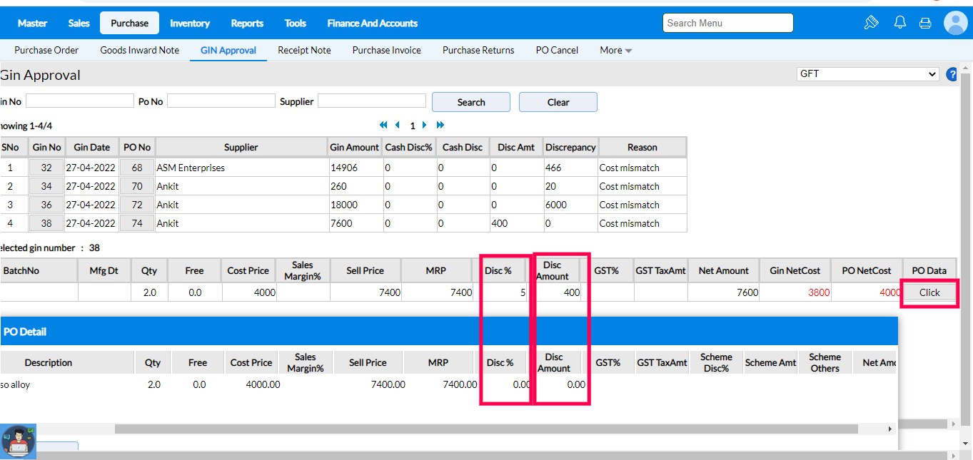 3. The comparison of POvsGIN for Purchase Order no 74 and Goods Inward Note no 38 is displayed. The GIN shows a discount of 400 whereas the PO shows a discount of 0.