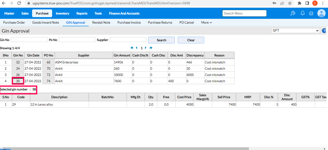 Using the GIN Approval screen, you can review only the Goods Inward Notes which are automatically marked as Unapproved due to variance in the Qty, Cost Price, or Tax between Purchase Order and the Supplier Invoice.