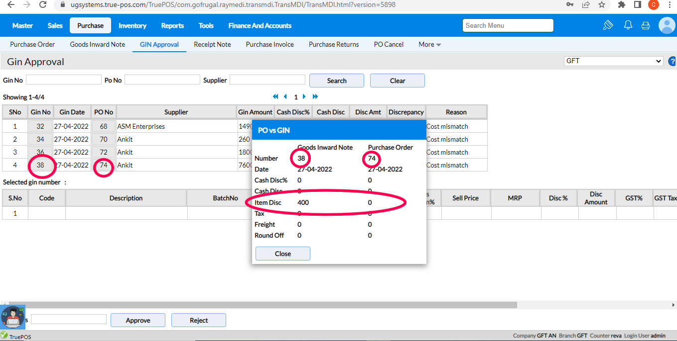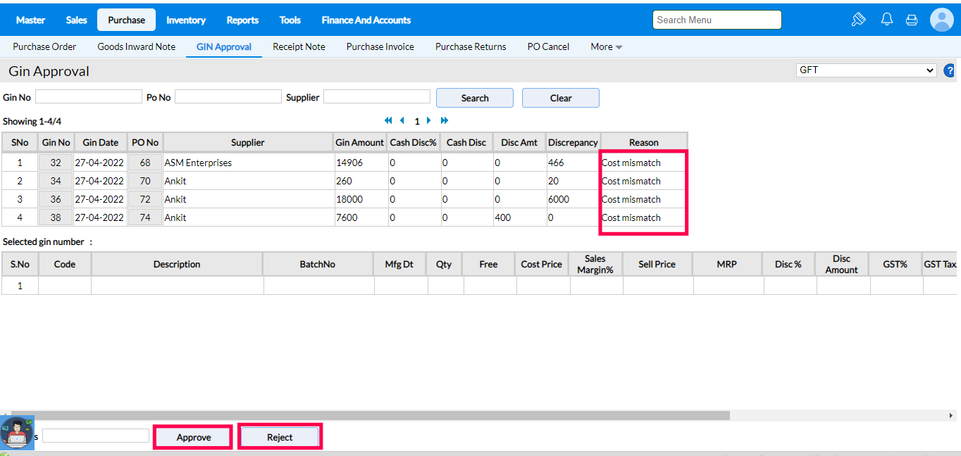 RetailEasy on-cloud supports Approval or Rejection of GINs that are unapproved due to mismatch as against PO.